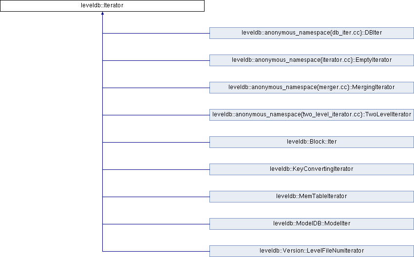 Implemented in leveldb::ModelDB::ModelIter, leveldb::KeyConvertingIterator, leveldb::Version::LevelFileNumIterator, leveldb::Block::Iter, leveldb::anonymous_namespace{db_iter.cc}::DBIter, leveldb::MemTableIterator, leveldb::anonymous_namespace{merger.cc}::MergingIterator, leveldb::anonymous_namespace{iterator.cc}::EmptyIterator, and leveldb::anonymous_namespace{two_level_iterator.cc}::TwoLevelIterator.